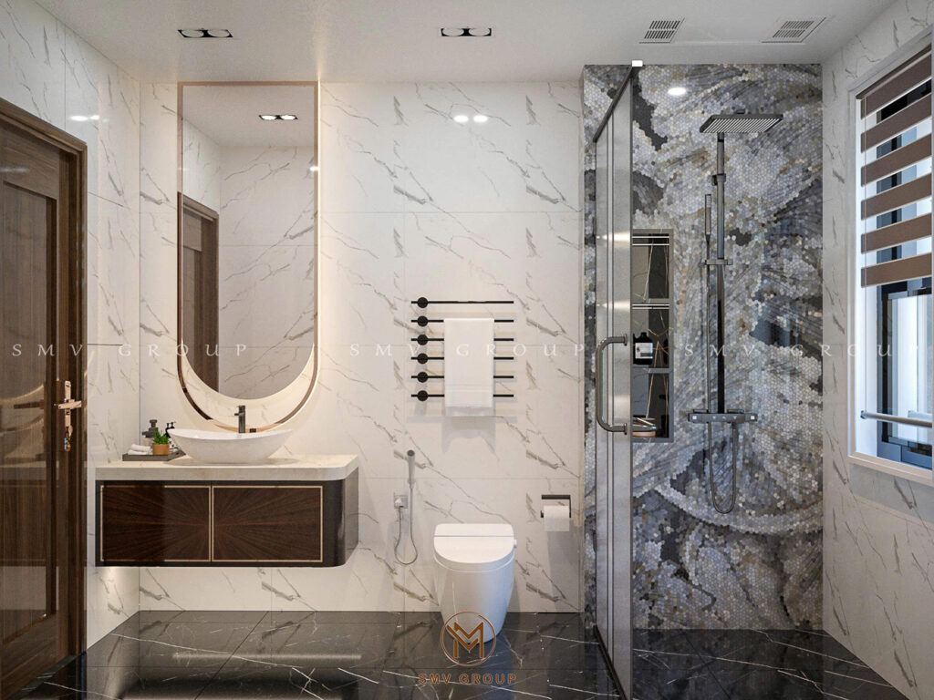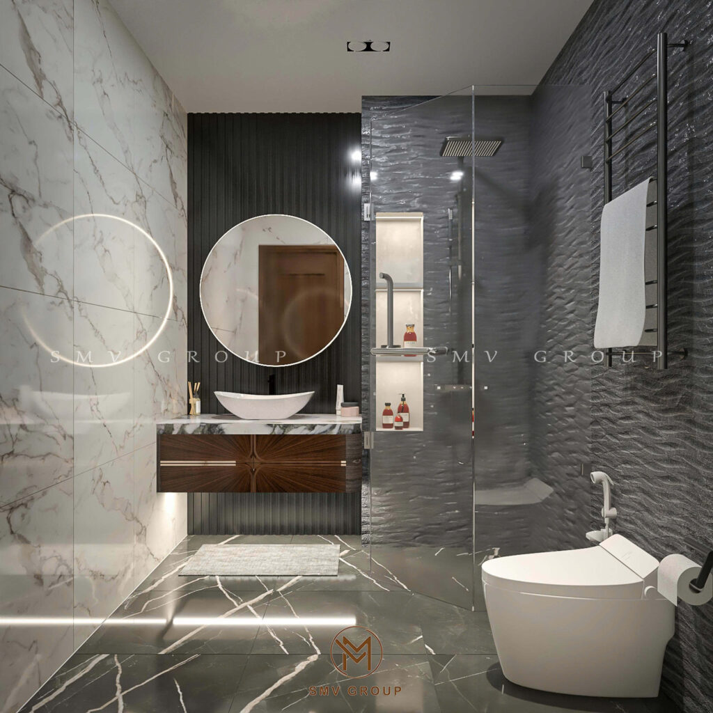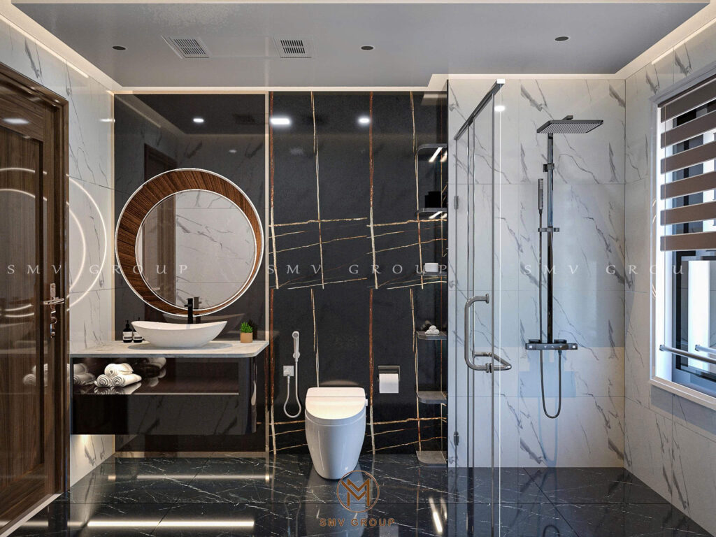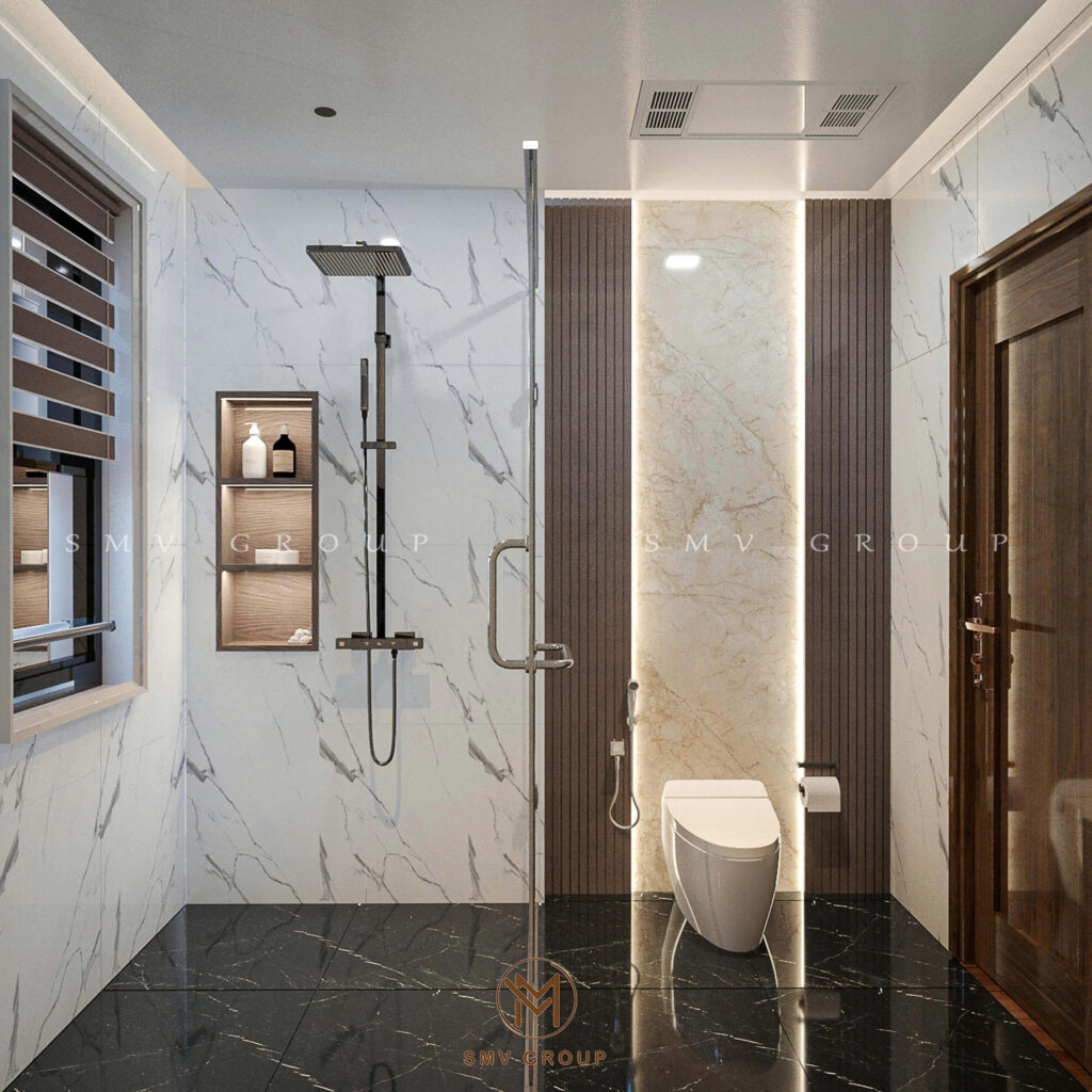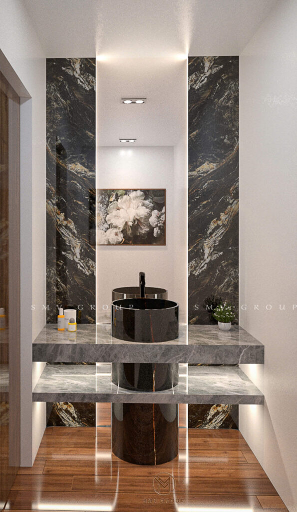 Phần trung tâm được ốp đá marble vân tự nhiên kết hợp đèn LED âm, giúp tôn lên giá trị thẩm mỹ của các vật phẩm trưng bày. Đây là chi tiết thường xuất hiện trong các biệt thự cao cấp khi triển khai Thiết kế nội thất sang trọng, bởi nó thể hiện gu thưởng thức tinh tế của gia chủ.
